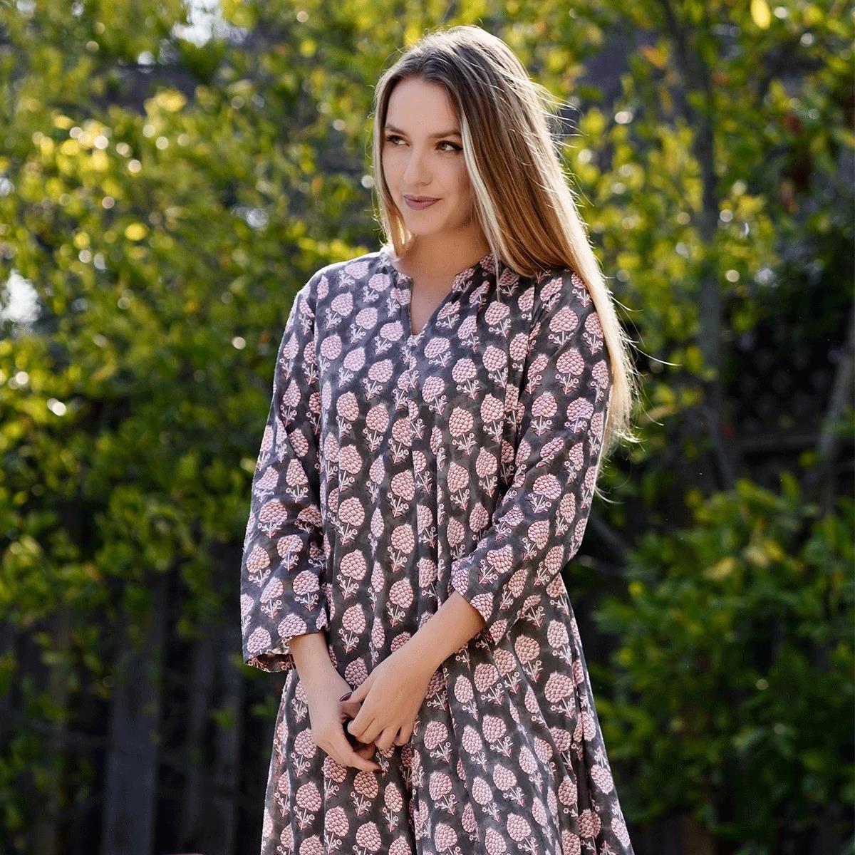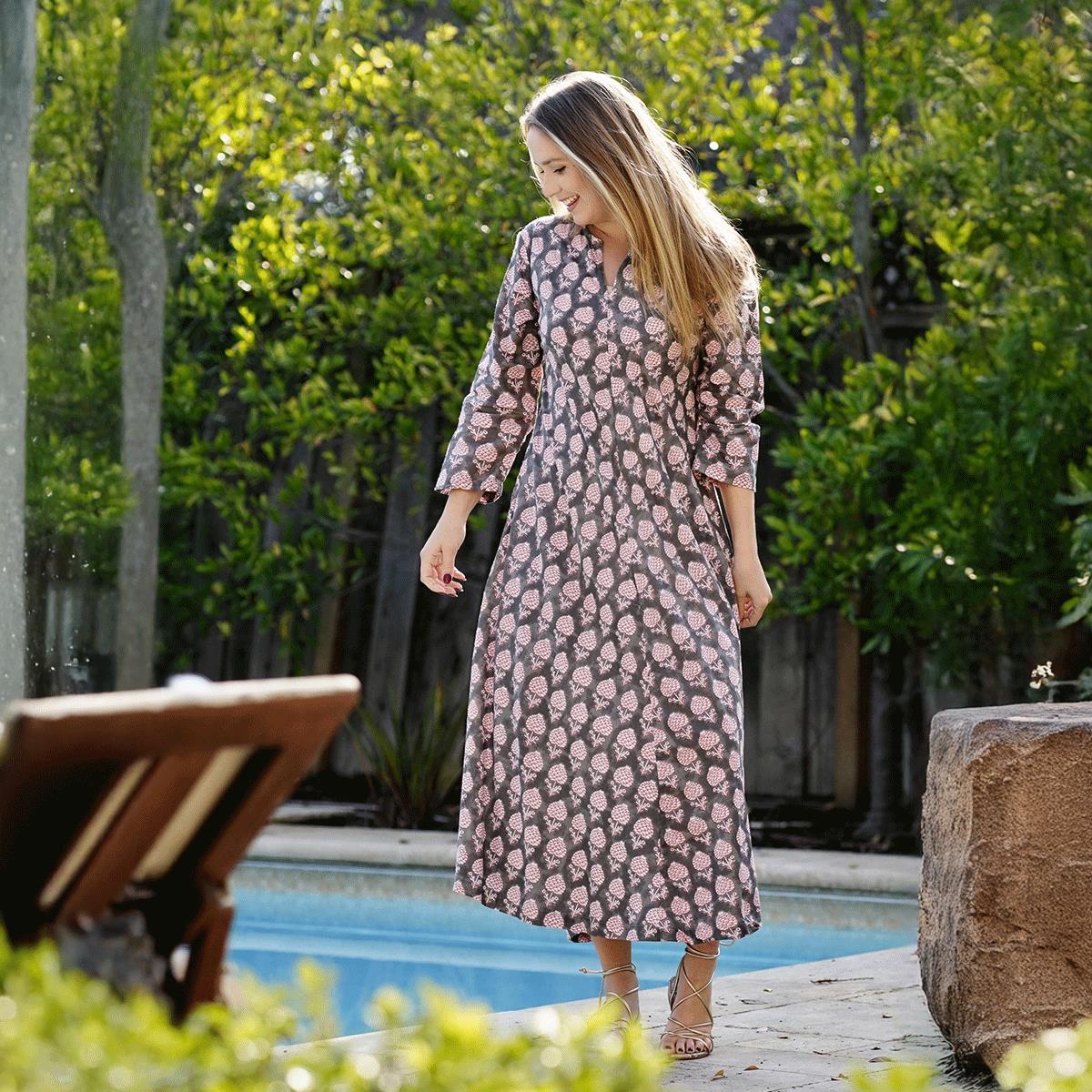 Vestido Dolma largo Calypso gris flor de loto cantidad