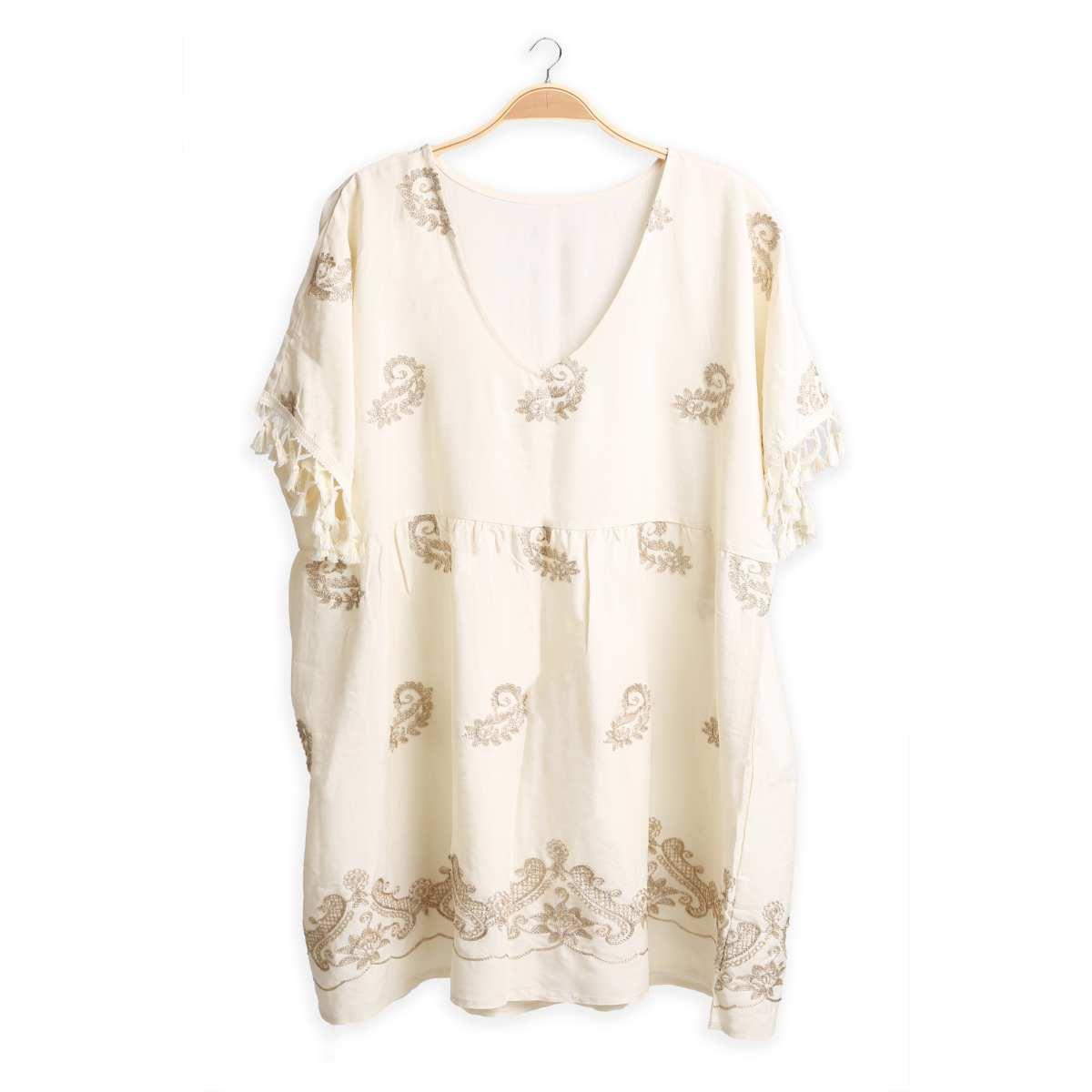 Vestido Jasmine corto flojo blanco con bordado dorado