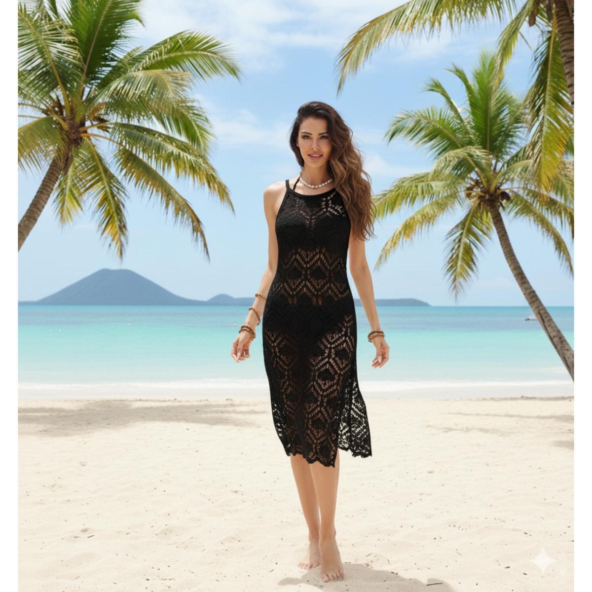 Vestido Stylish corto cuello alto crochet negro mujer cantidad