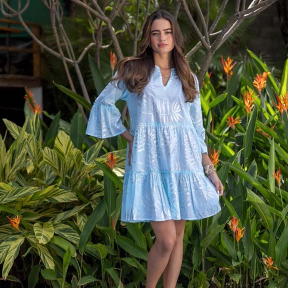 Vestido Sunny Oceans corto M/L celeste hojas plateadas